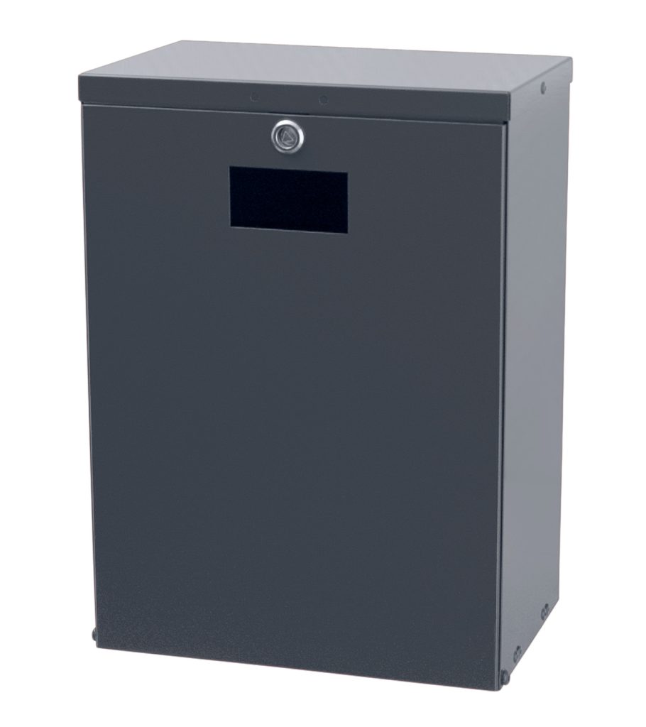 Diskret og stilrent skab i stål til indsamling af batterier og/eller el-pærer. Skabet låses med trekantnøgle, og har på bagsiden huller til montering på væg eller stolpe. Skabet fås i to størrelser: et rum på 9 liter eller 2 rum med 2×9 liter.